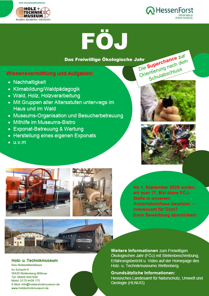 Für die Zeit vom 1. September 2026 bis 31. August 2027 ist im Holz- und Technikmuseum Wettenberg erneut die FÖJ-Stelle zu besetzen. Beim Anschauen des Flyers kannst Du unschwer erkennen, dass die FÖJ-Tätigkeit bei uns vielseitig, interessant und abwechslungsreich ist. Auf den folgenden Seiten erfährst Du alles, was Du für ein Engagement im Rahmen des Freiwilligen Ökologischen Jahres (FÖJ) wissen solltest.